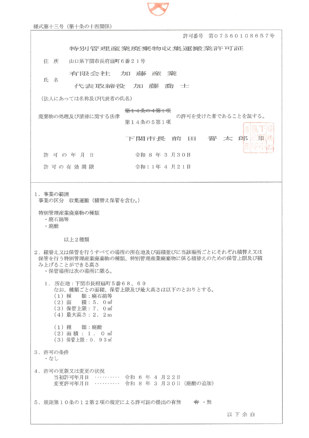 下関市許可番号 (優良)第07520108657号