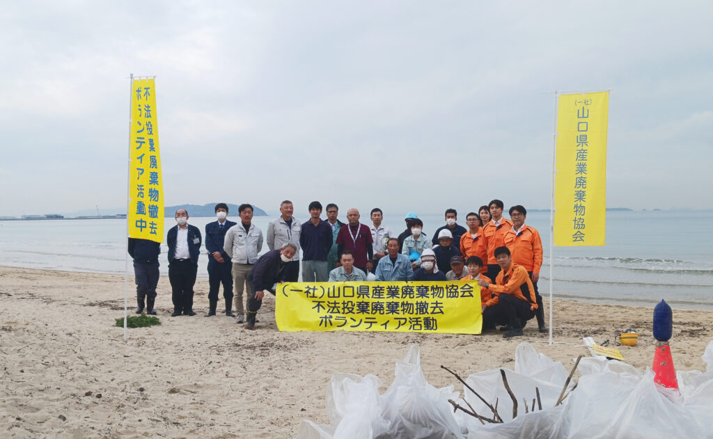 山口県産業廃棄物協会が主催する「不法投棄廃棄物撤去活動」に参加し、綾羅木海岸の清掃を行いました。